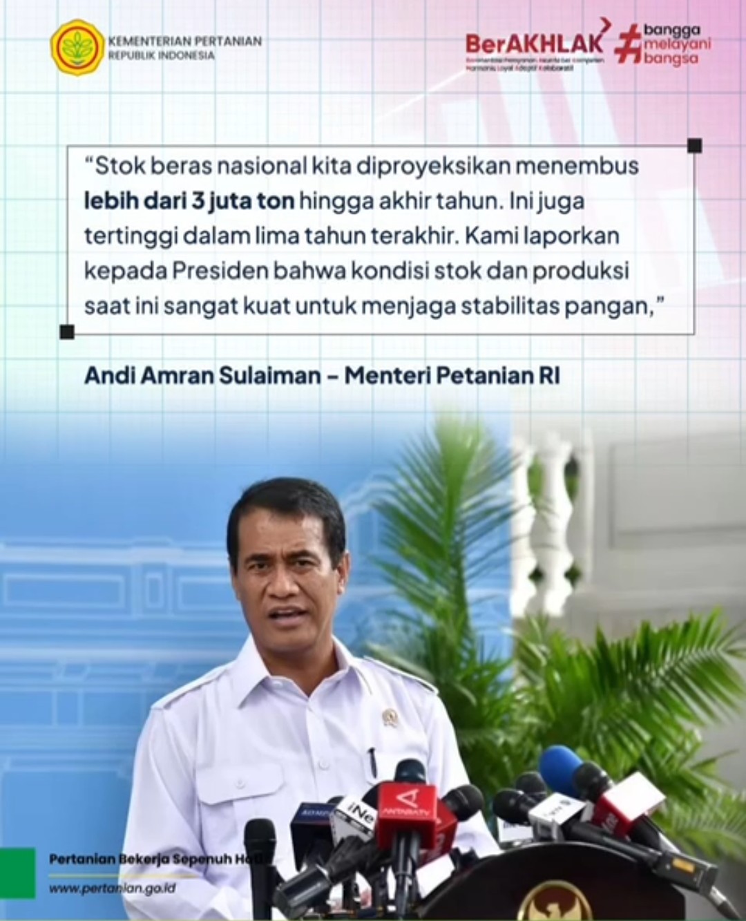 Menteri Pertanian Andi Amran Sulaiman mengapresiasi kerja keras petani, penyuluh, dan semua pihak yang terlibat dalam meningkatkan ketahanan pangan nasional.