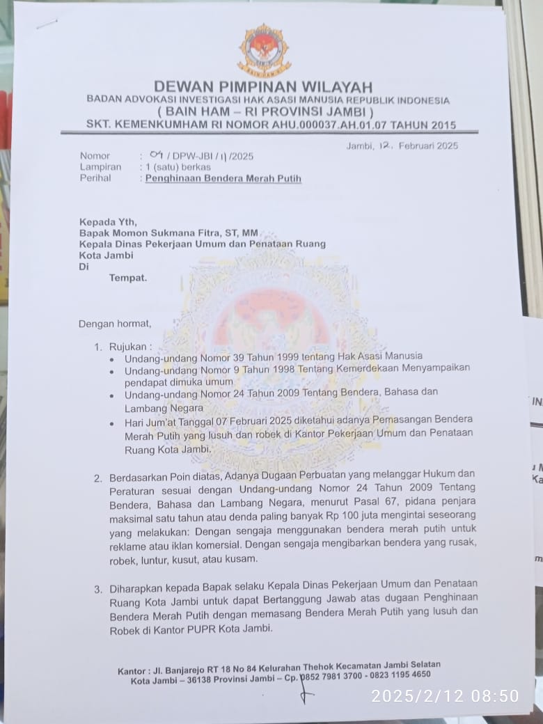 JAMBI.MPN _ DPW Badan Advokasi Investigasi Hak Asasi Manusia Republik Indonesia (BAIN HAM-RI) Provinsi Jambi resmi layangkan surat atas dugaan penghinaan Bendera Merah-putih yang dikibarkan dengan kondisi lusuh dan robek di Kantor PUPR Kota Jambi Kepada Kadis PUPR , Rabu (12/02/2025).
