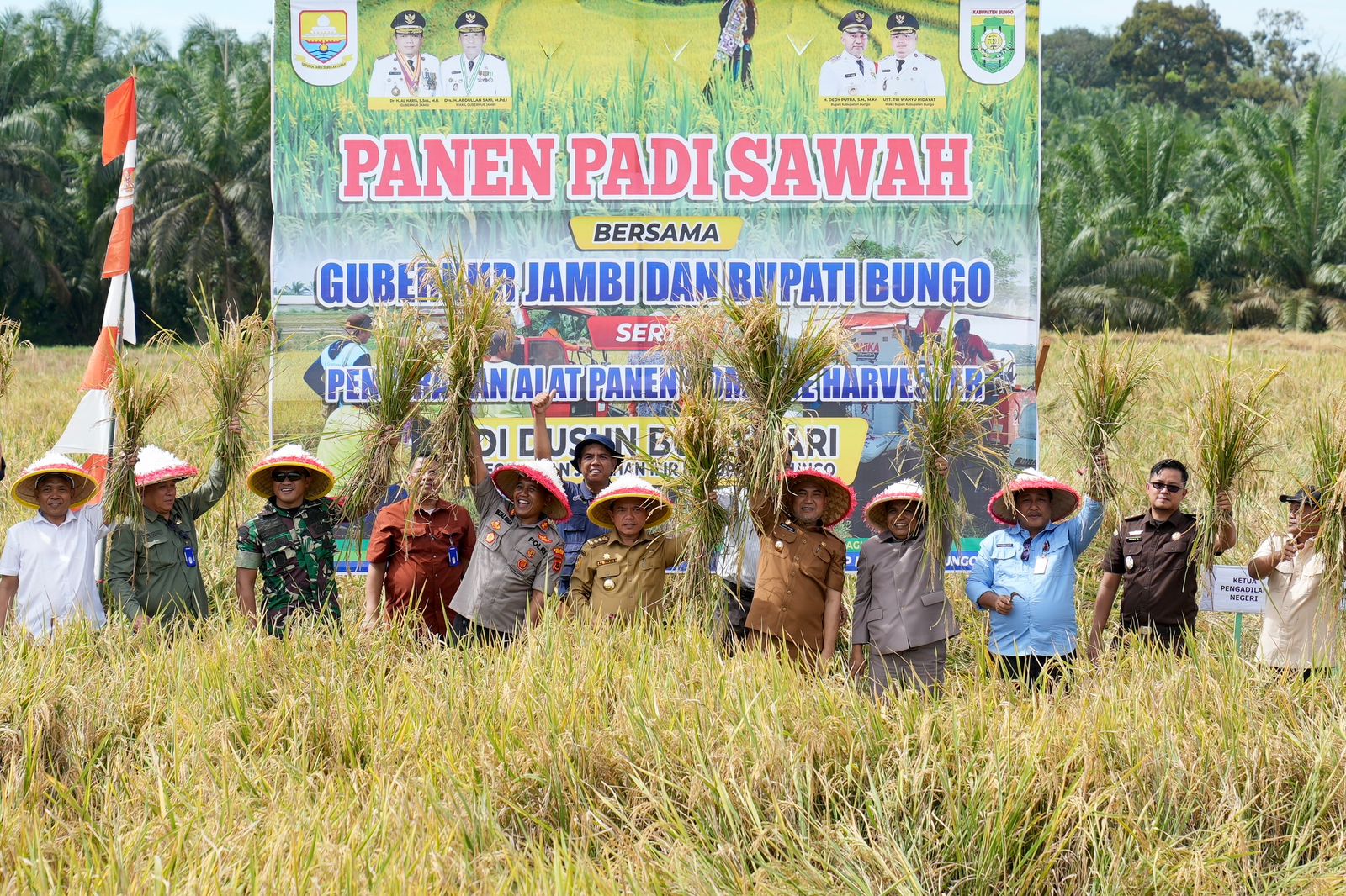 JAMBI.MPN-Kab.Bungo – Komitmen TNI Angkatan Darat dalam menjaga ketahanan pangan nasional kembali dibuktikan. Komandan Kodim 0416/Bungo Tebo, Letkol Inf Dedy Pungky Irwanto, S.I.P., M.I.Pol, hadir langsung dalam kegiatan Panen Raya Padi Sawah, Penyerahan Combine Harvester, dan Tanam Padi Musim Tanam (MT) III bersama Gubernur Jambi Dr. H. Al Haris, S.Sos., M.H. dan Bupati Bungo H. Dedy Putra, S.H., M.Kn, di Dusun Bukit Sari, Kecamatan Jujuhan Ilir, Kabupaten Bungo, Selasa (6/8/2025).