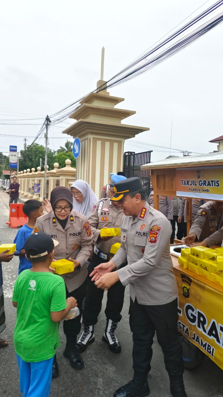 JAMBI.MPN – Dengan penuh senyum kebahagiaan, Kapolresta Jambi Kombes Pol Boy Sutan Binanga Siregar, S.I.K.,M.H, didampingi Kabag Log Kompol Azimnayanti, S.I.P.,M.M, Kasikum dan perwakilan Bag dan Sat Polresta Jambi kembali membagikan takjil buka puasa gratis kepada warga dan pengendara yang melintas dikawasan depan Mapolresta Jambi, yang berlokasi di Jalan Bhayangkara, Kelurahan Talang Banjar, Kecamatan Jambi Timur Kota Jambi, Minggu (09/03/2025).