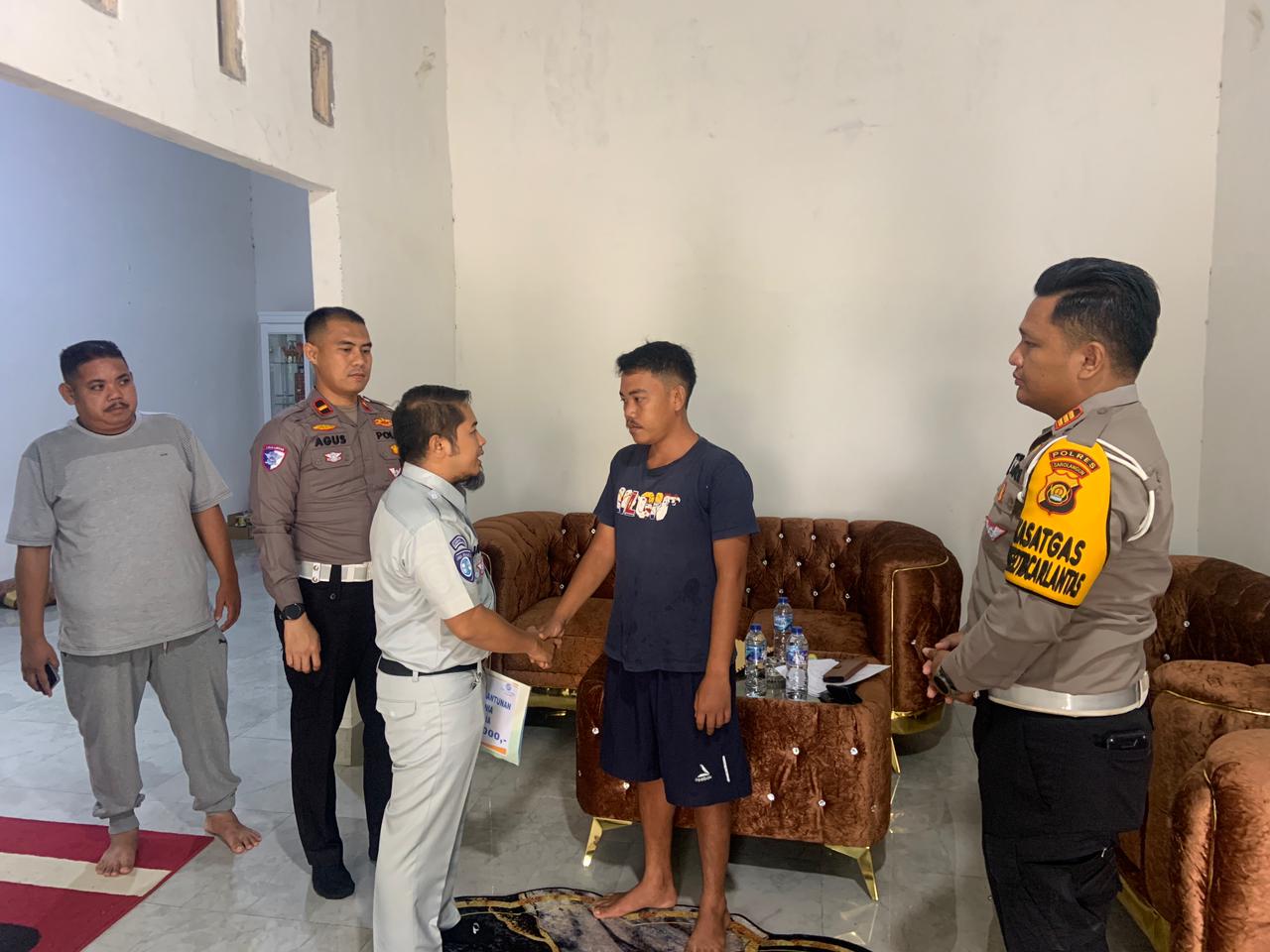 Kapolres Sarolangun AKBP. Budi Prasetya. S.IK., M.Si melalui Akp. Rio Renaldy Siregar. S.T.K. S.IK. laksanakan Penyerahan Santunan bersamaan Kepala Jasa Raharja Kabupaten Sarolangun Jarianto serta di dampingi perwira Staf dan personil Satlantas Polres Sarolangun.