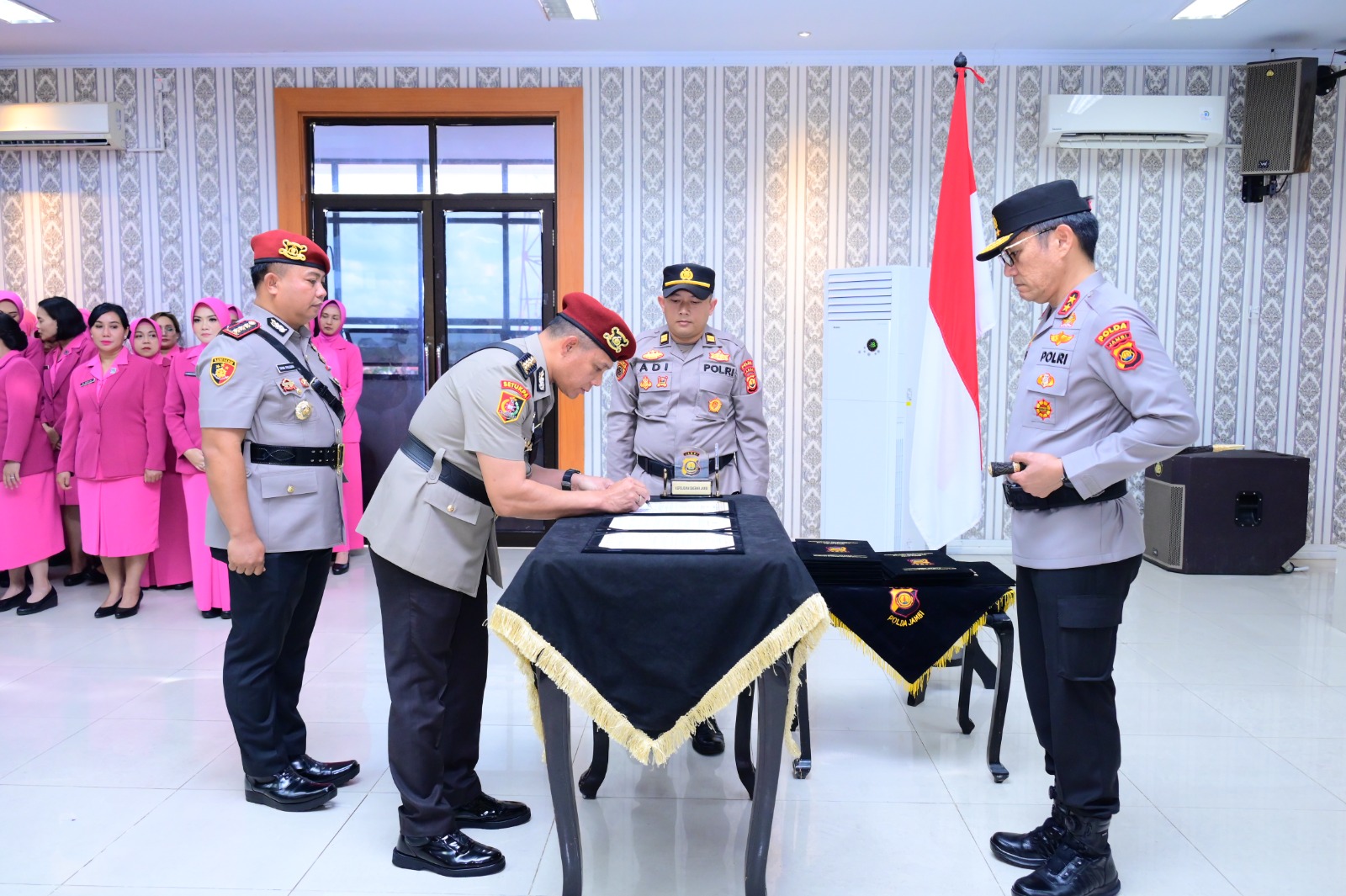 Turut hadir Wakapolda Jambi Brigjen Pol. M. Mustaqim, Irwasda Polda Kombes Pol. Jannus Parlindungan Siregar, serta Ketua Bhayangkari Daerah Jambi Ny. Evi Krisno Siregar. Deretan pejabat tinggi, Bhayangkari, dan personel turut memberikan penghormatan atas pengabdian para pejabat lama serta menyambut pejabat baru dengan penuh harapan.