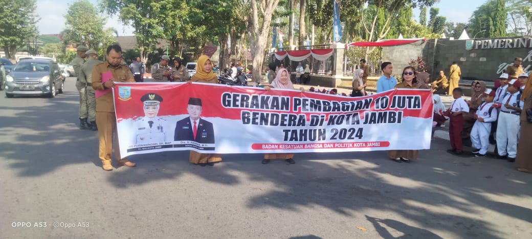 Pada kesempatan ini, bendera merah putih dibagikan secara simbolis kepada Camat se-Kota Jambi, dan dilanjutkan dengan pembagian kepada masyarakat yang melintas di sekitar Tugu Keris. Kegiatan ini juga dihadiri oleh Penjabat Walikota Jambi, Forkopimda kota Jambi, Camat se-Kota Jambi, Lurah se-Kota Jambi, serta perwakilan siswa-siswi SD dari berbagai sekolah di Kota Jambi.