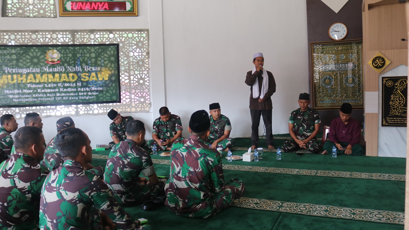 Komandan Kodim 0416/Bute Letkol Inf Arief Widyanto, S.E., M.Han dalam sambutannya mengatakan, peringatan Maulid Nabi Muhammad SAW dilaksanakan salah satunya bertujuan untuk lebih meningkatkan dan memantapkan keimanan dan ketaqwaan kepada Allah SWT.”