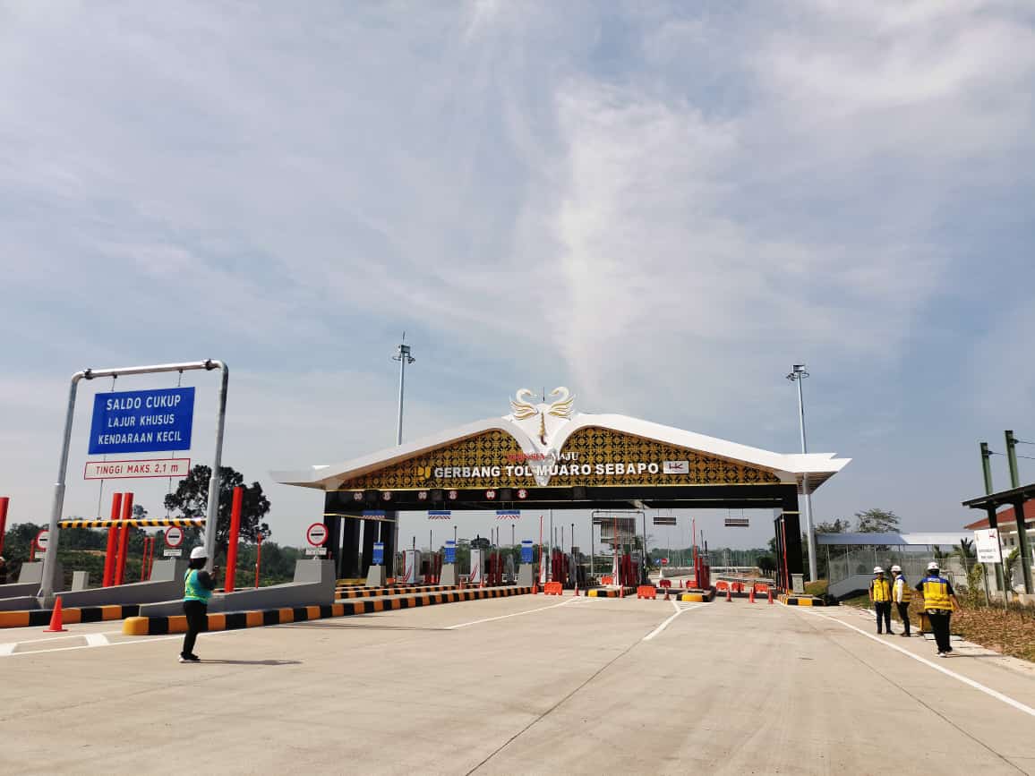 Rombongan media ditemani pihak satker melihat progress pembangunan jalan tol tersebut melewati pintu Tol Muara Sebapo.