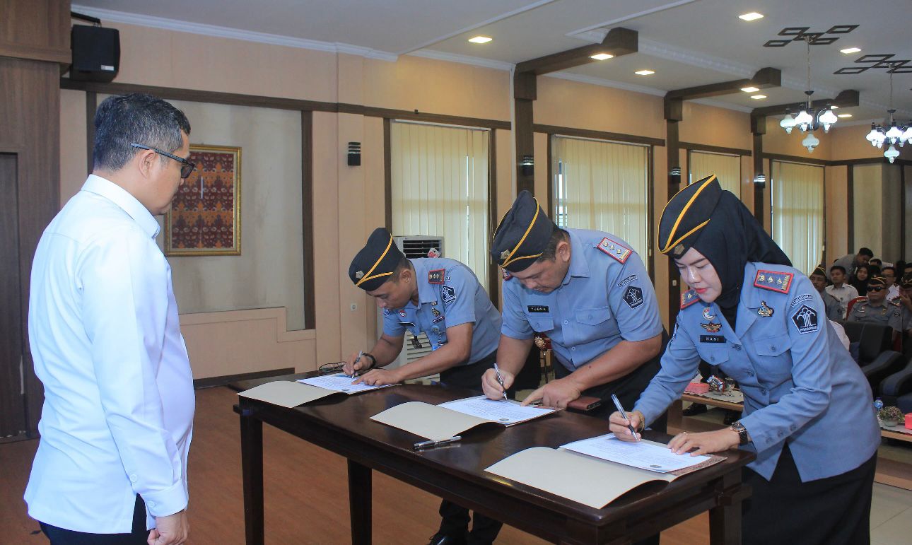 JAMBI.MPN – Kepala Kantor Wilayah Direktorat Jenderal Pemasyarakatan Jambi, Hidayat, beserta para pejabat dan jajaran kepala Unit Pelaksana Teknis (UPT) di lingkungan Kanwil Ditjenpas Jambi laksanakan pencanangan Pakta Integritas dan Penandatanganan Kinerja Pimpinan Tinggi, Senin (20/1).