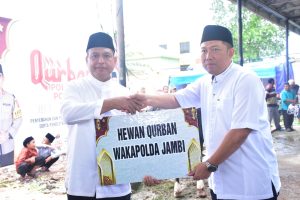 Kapolda Jambi Irjen Pol. Krisno H. Siregar secara simbolis menyerahkan hewan qurban kepada Karo SDM Polda Jambi selaku Ketua Panitia Qurban. Total hewan qurban yang diserahkan berjumlah 15 ekor sapi dan 3 ekor kambing, yang seluruhnya telah dinyatakan sehat dan layak konsumsi oleh Dinas Peternakan Kota Jambi dan Dokter Hewan Polda Jambi, Kompol drh. Fitri Patmawati.