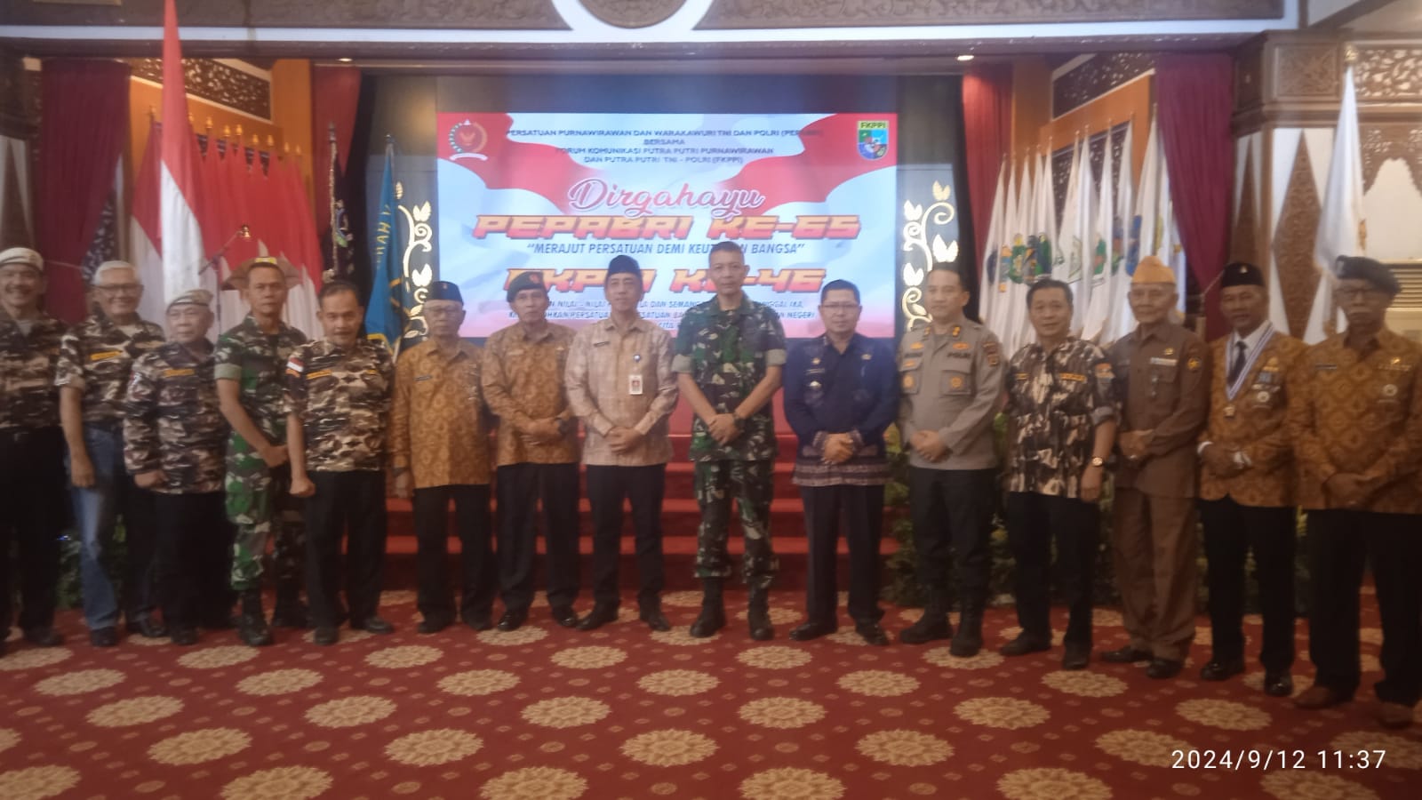 JAMBI.MPN _ Peringatan Hari Ulang Tahun (HUT) ke-65 Persatuan Purnawirawan dan Warakawuri TNI-POLRI (Pepabri) serta HUT ke-46 Forum Komunikasi Putra Putri Purnawirawan dan Putra Putri TNI-Polri (FKPPI) berlangsung meriah dan khidmat di auditorium Rumah Dinas Gubernur Jambi, Kamis, 12 September 2024. Acara yang mengusung tema “Rajut Persatuan Demi Keutuhan Bangsa” ini mencerminkan semangat persatuan dan kebangsaan yang mendalam.