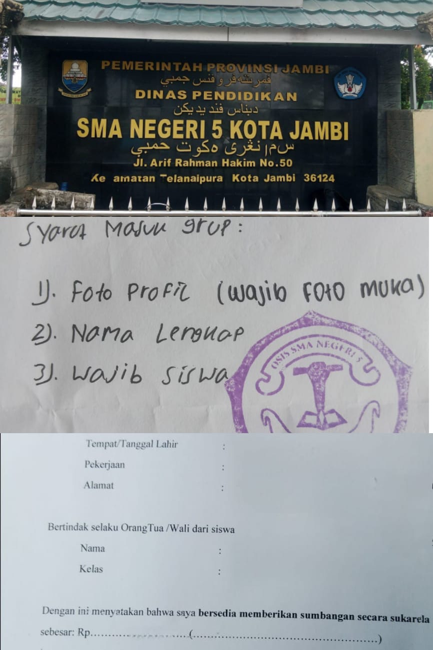 JAMBI.MPN – Praktik pungutan liar (pungli) yang dibungkus dengan istilah “sumbangan sukarela” kembali mencoreng dunia pendidikan. Kali ini terjadi di SMA Negeri 5 Kota Jambi, menyusul proses daftar ulang siswa baru tahun ajaran 2025/2026. Sejumlah orangtua murid mengaku dipaksa secara halus untuk memberikan uang sumbangan kepada panitia OSIS, meski tidak ada ketentuan resmi yang mewajibkan.