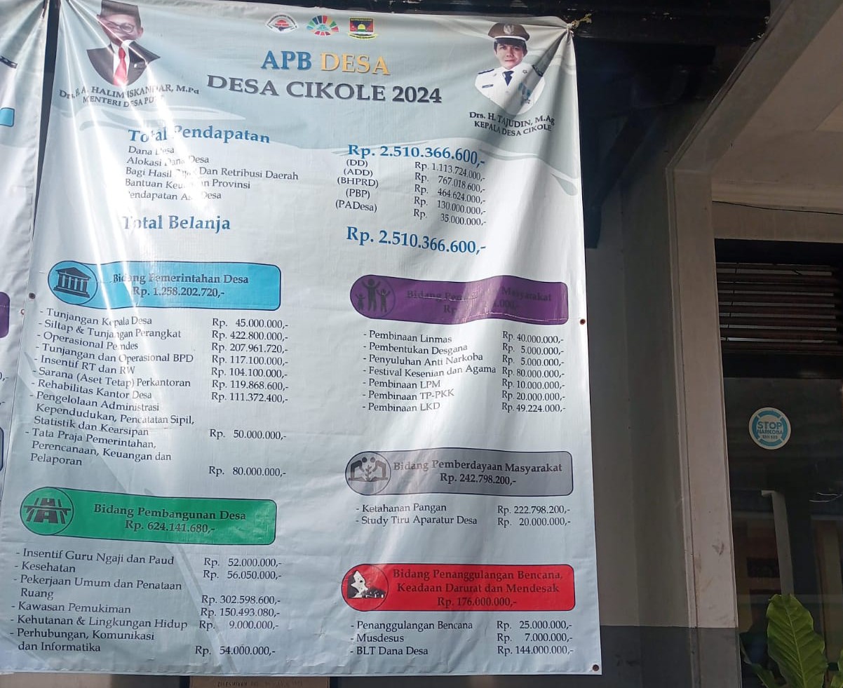 Menurutnya sebagai bentuk transparansi, semua anggaran baik pada tahun sebelumnya maupun 2024 dipampang pada spanduk di depan kantor desa. “Ini sebagai bentuk transparansi dari pemerintahan Desa Cikole, semua orang bisa melihat dengan jelas termasuk media.