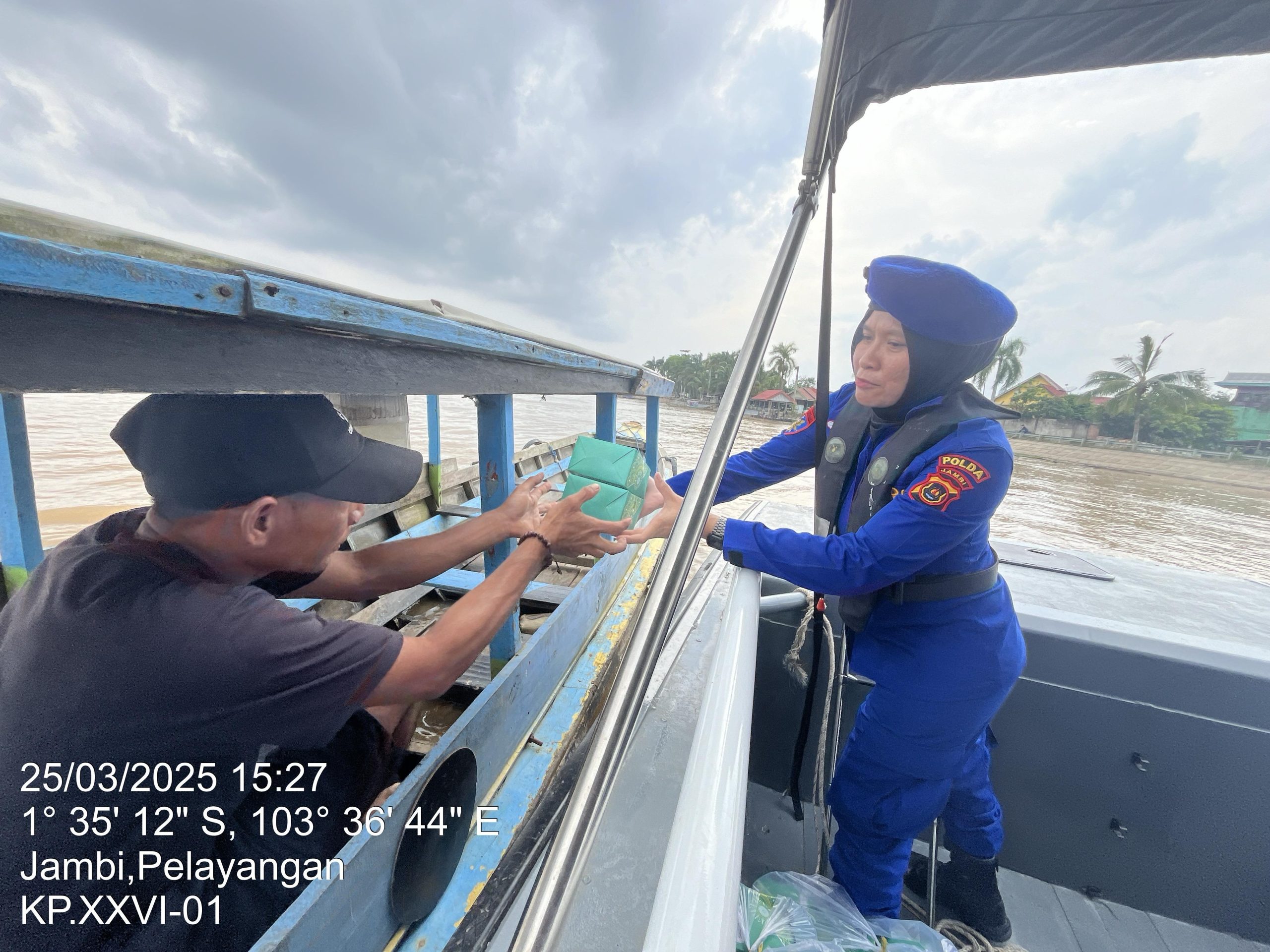JAMBI.MPN _ Srikandi Ditpolairud Polda Jambi melaksanakan kegiatan bagi-bagi takjil kepada masyarakat menggunakan KP SWB . XXVI 02 Pada Selasa (25/03/2025).