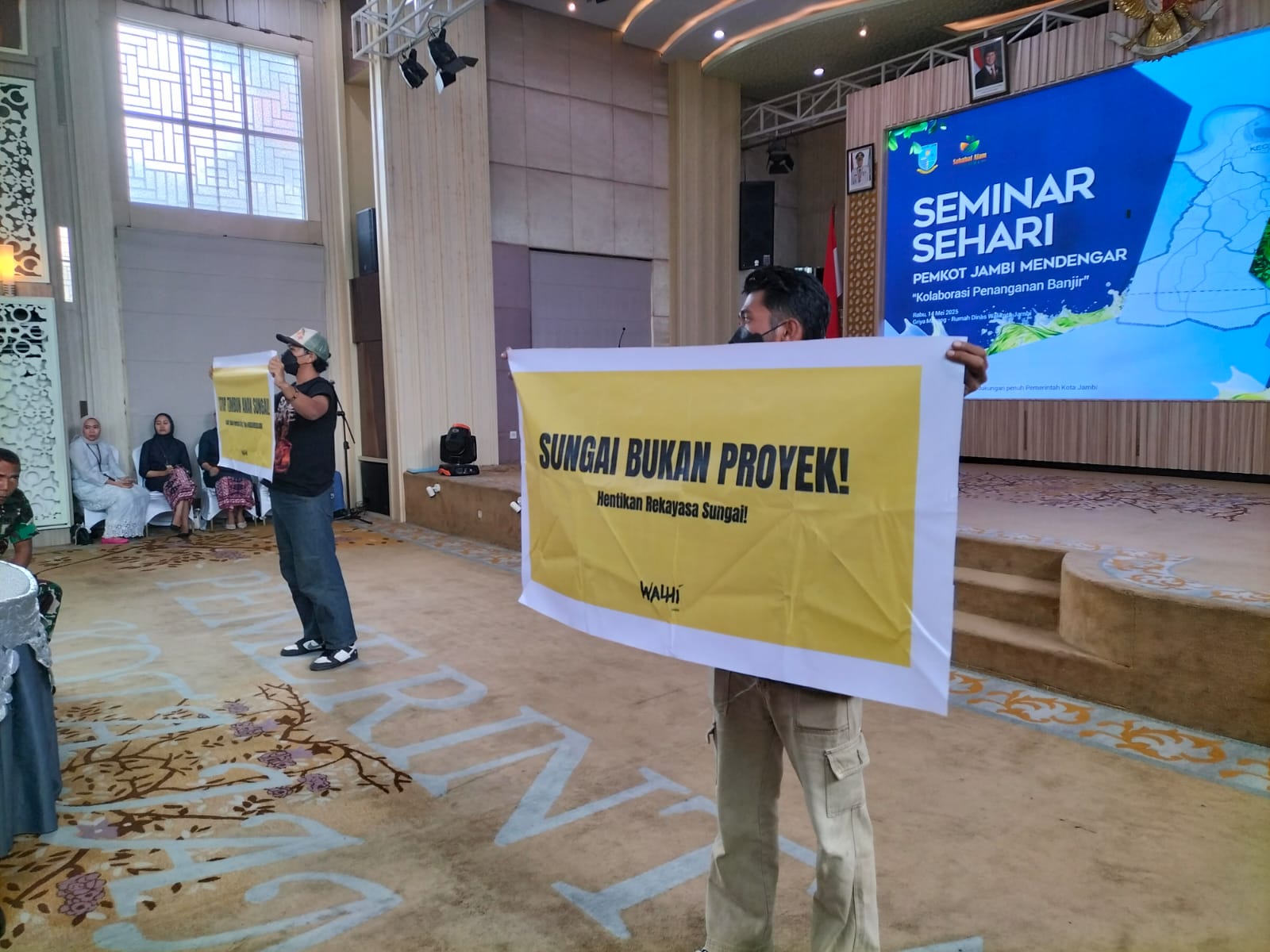 JAMBI.MPN – Wahana Lingkungan Hidup Indonesia (Walhi) Jambi menggelar aksi protes serta meminta Pemerintah Daerah Jambi tegas menghukum perusahaan yang merusak lingkungan dan menimbulkan kerugian ekologis. Aksi ini disampaikan dengan membentang poster dalam forum Seminar Sehari “Pemkot Jambi Mendengar” yang berlangsung di aula Rumah Dinas Walikota Jambi, Rabu (14 Mei 2025).