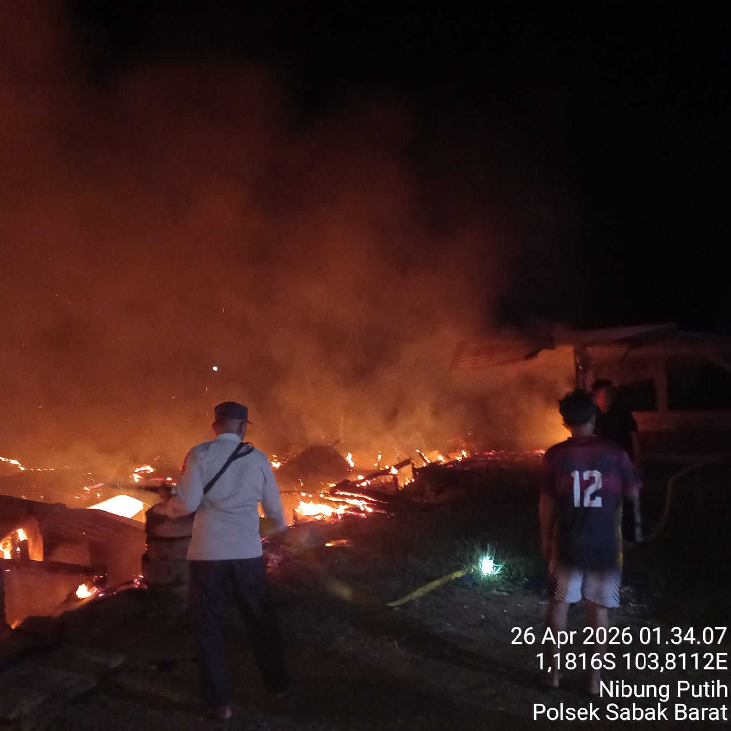 JAMBI.MPN-Kab.Tanjab Timur — Suasana dini hari yang seharusnya tenang berubah menjadi kepanikan di RT 06 RW 01, Kelurahan Nibung Putih, Kecamatan Muara Sabak Barat, Minggu (26/04/2026) sekitar pukul 00.30 WIB. Kobaran api tiba-tiba melahap permukiman warga, menghanguskan dua rumah dan delapan pintu bedeng dalam waktu singkat.